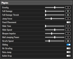 Added in update 1.1.2. A slider turned on by default, the "sliding" setting allows you to disable/enable sliding in your custom game. At first glance it seems like a relatively useless mechanic, but this setting is actually very useful when hosting a Parkour map. This is because in parkour maps crouching in midair is the usual way to slow down in midair and steady yourself to land on platforms, but if you are still crouching when you land on a platform, you will slide which may cause you to slide off platforms. Turning sliding off will make it much easier to control your jumps.